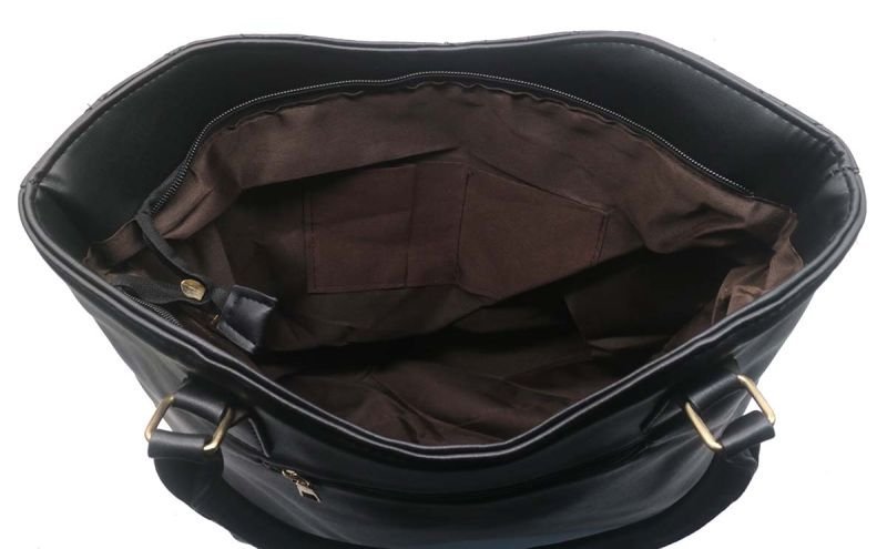 Aan de achterzijde van de tas zit ook nog een vak met ritssluiting. Tot slot wordt de tas geleverd met een matchende portemonnee.